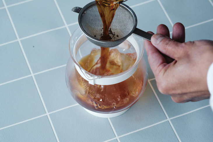 - 氷を入れた別のポットに茶葉を濾しながら移し替える